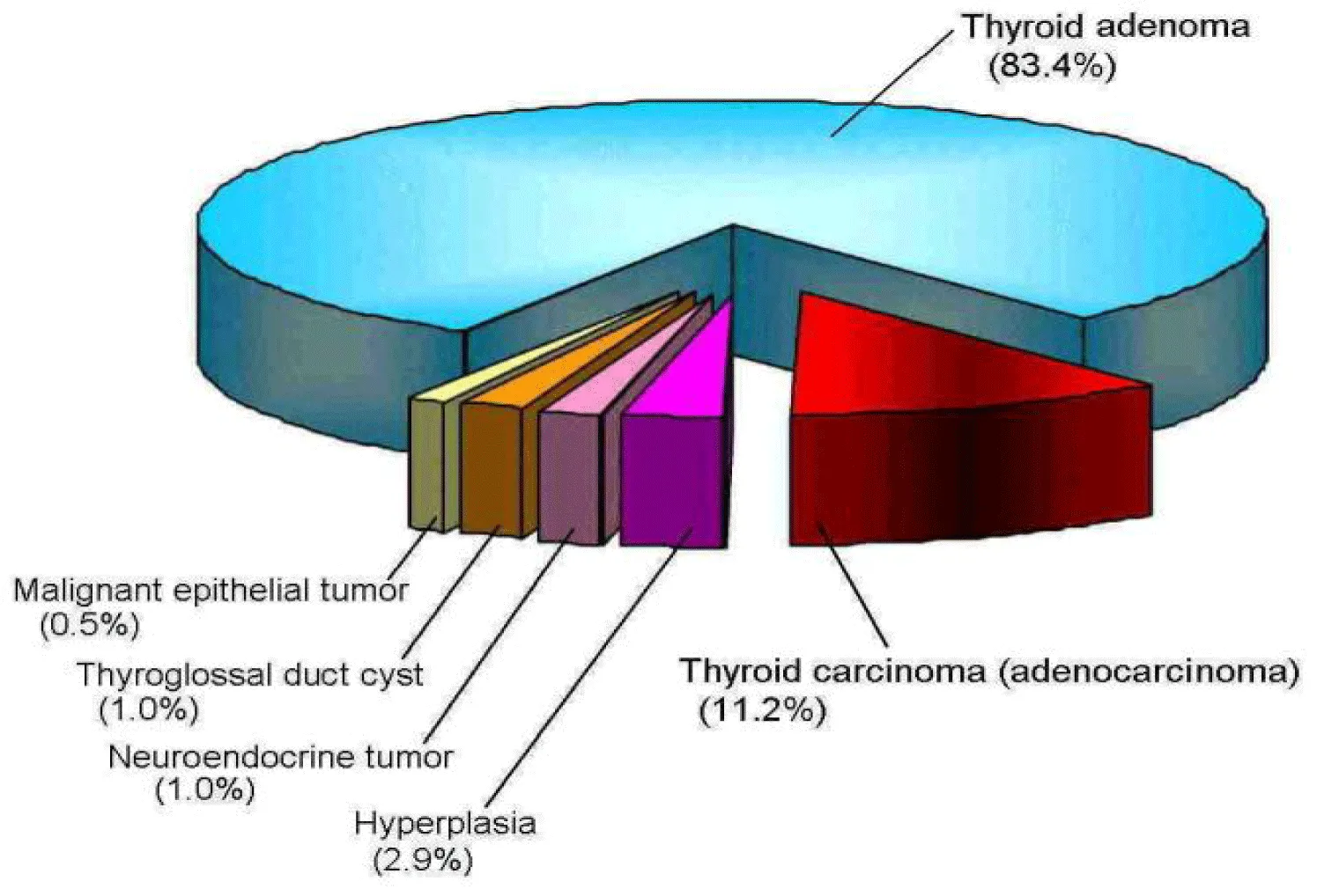 It is generally known that adenoma is a benign tumor (i.e., non-cancerous) arising from glandular tissue and carcinoma with metastasis ability is a malignant tumor derived from epithelial cells. Previous studies have reported that feline hyperthyroidism is the result of a malignant thyroid carcinoma (adenocarcinoma) in ~2% of diagnosed cases and a benign functional adenoma is responsible in ~98% of diagnosed cases [11,12]. By contrast, the results summarized in figure 2 show a comparatively high rate (~11%) of thyroid carcinoma and a comparatively low rate (~83%) of thyroid adenoma in the examined samples.