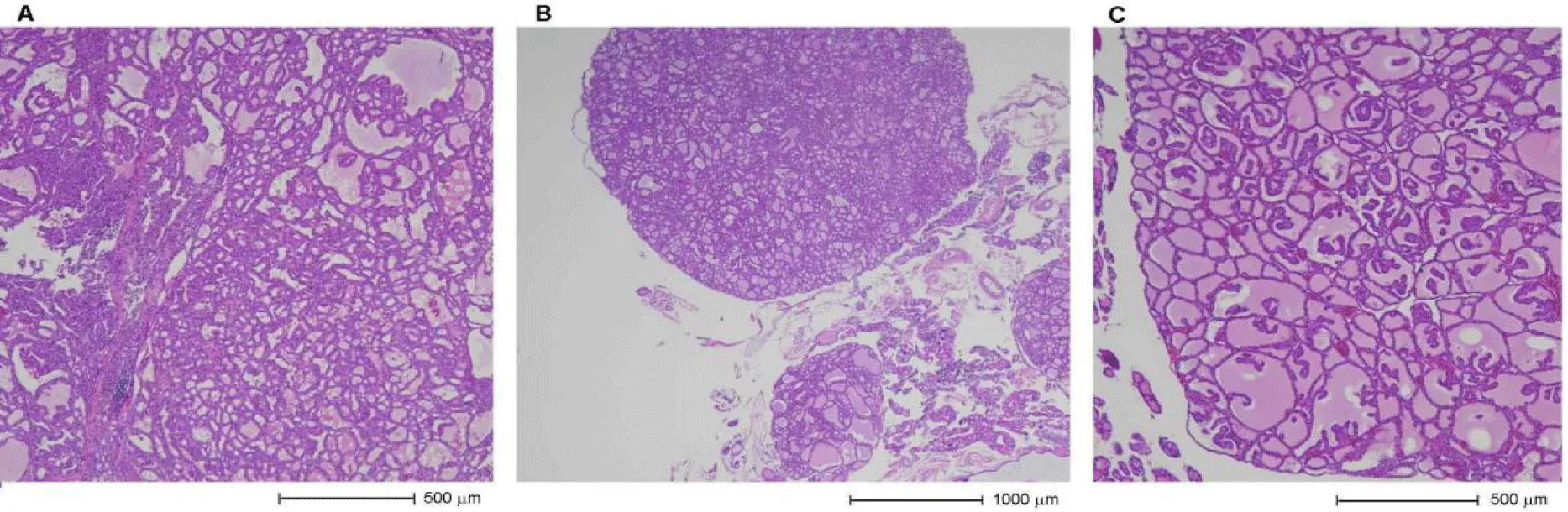 A cat with ID number BP20-1438 is characterized as a mixed breed, sterilized female of 15 years of age at the time. When she had a health check including a T4 blood test in October 2019, she was diagnosed with hyperthyroidism on the basis of 13.2 μg/dL T4 value (cf. reference range of 0.9‒3.7μg/dL). As treatment, 2.5 mg/day of mercazole (brand name methimazole) was administered to her every day, and she was not interested in any veterinary diets containing low levels of iodine; in consequence, the T4 value decreased only to 6.4μg/dL in November. The drug dose was increased to 4.0 mg/day, and the T4 value dropped to 2.7μg/dL in December; however, she had serious side effects during her medical therapy, in particular intense itchiness. She often scratched her face and ears because of her itchiness, and they were torn and bled. Finally, she had a thyroidectomy in January 2020. The thyroid tissues sampled from her thyroidectomy are shown in figure 3 - there were follicular-patterned lesions (Figure 3A) in multi-nodular form (Figure 3B) in the thyroid glands, and these lesions were well-circumscribed (Figure 3C) and comparatively inhomogeneous. Furthermore, they did not infiltrate through the surrounding normal tissues, so this cat was pathologically diagnosed as having a benign thyroid adenoma.