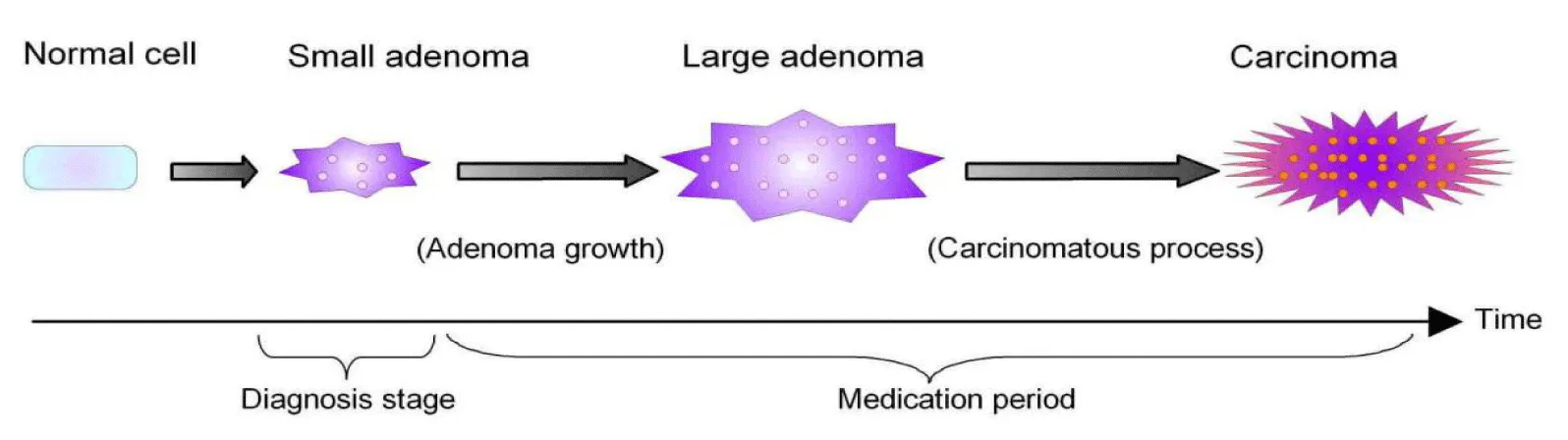 A cross-section study based on 2,096 hyperthyroid cats has hypothesized that the prevalence of “suspected” thyroid carcinoma increases with increasing duration of medication [26]. This hypothesis is consistent with the above-mentioned speculation, so the following theory is built to interpret an obvious increase in the carcinoma rate (Figure 4): (i) anti-thyroid medication such as methimazole does not decrease tumor size [16,22], (ii) adenomatous tissues continue to grow over time despite medical therapy, and (iii) this growth predisposes the initiation of a carcinomatous process. The above-mentioned steps are illustrated in figure 4 to facilitate understanding of the proposed theory. It is broadly accepted that the adenoma-carcinoma sequence represents the process by which most colorectal cancers arise in humans (reviewed in [27,28]). A simplified version of this sequence is basically the conversion of normal colonic mucosa → (i) benign adenoma → (ii) advanced adenoma → (iii) ultimately progressing to carcinoma (reviewed in [27]). Thus, the feline sequence in thyroid carcinoma development seems to be similar to the human adenoma-carcinoma sequence in colorectal cancers (Figure 4).